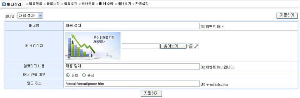 ④ 배너 진행 여부 : 진행, 중지를 선택할 수 있으며, 중지인 경우 블록 내에 배너가 포함되어 있어도 www에서 노출되지 않음. 이 경우 해당 배너 위치에는 ‘환경설정’에서 지정한 배너 자동 노출 |