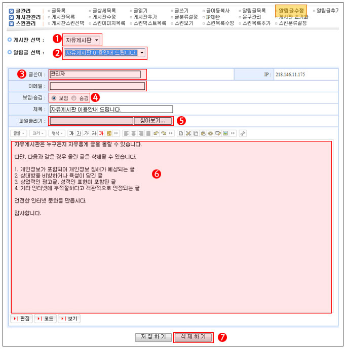 | ⑦ 알림 글을 삭제할 수 있습니다. |