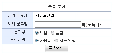 (3) 노출여부 : 보임을 선택하면 해당 분류가 메뉴로 출력됩니다. 숨김으로 선택하면 분류는 생성되나 메뉴로 활용되지 않습니다.