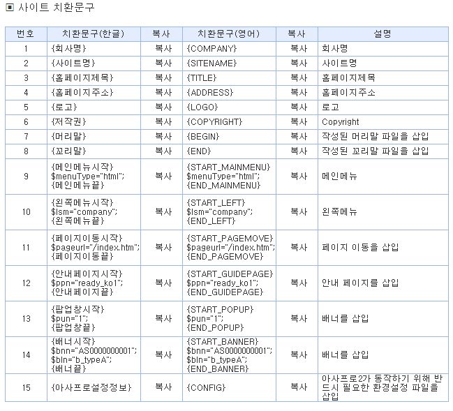 (2) 치환문구는 복잡한 프로그램 소스 또는 html을 사용자의 편의를 위해 {치환문구}의 형태로 표현한 것입니다.