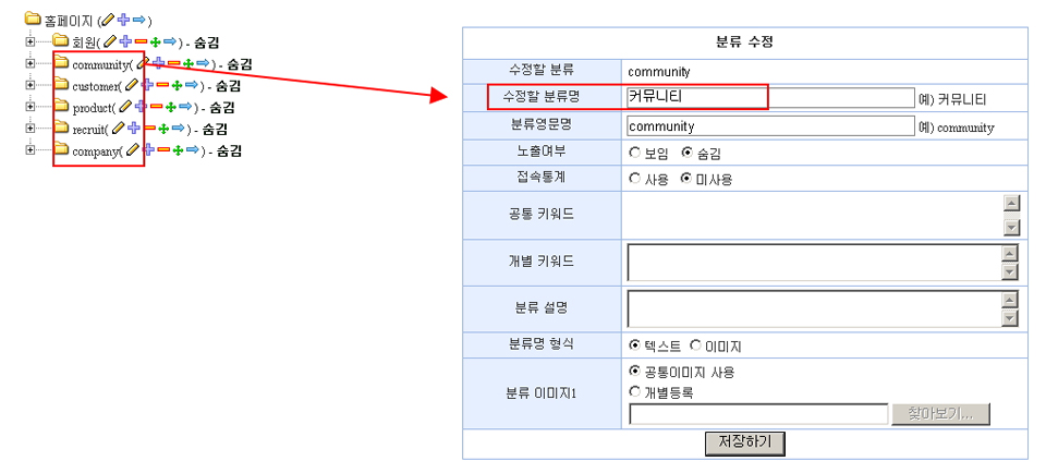 | (1) 영문명으로 추가된 메뉴명을 각 메뉴에 맞게 변경해 줍니다. |