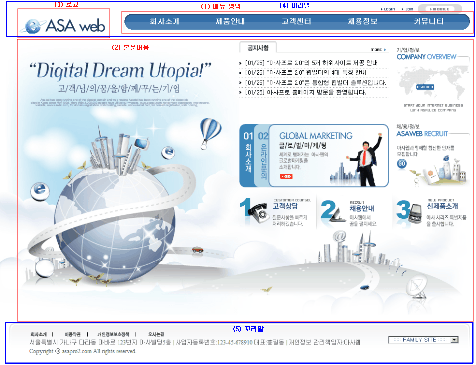 | (1) 메뉴 : 회사소개 ~ 커뮤니티까지의 상단 메뉴 부분이 메뉴 영역입니다. |
