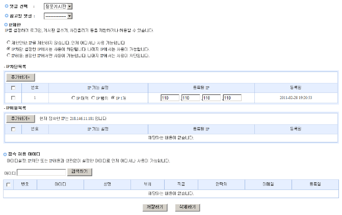- 댓글에 글을 올릴 때 특정 아이피에서 댓글을 쓰지 못하도록 차단하거나 특정 아이피에서만 글을 올릴 수 있도록 설정할 수 있습니다.