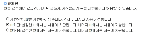 - IP제한, IP허용 중 원하는 종류를 선택합니다. IP제한을 하지 않으려면 제안안함을 선택하면 됩니다.