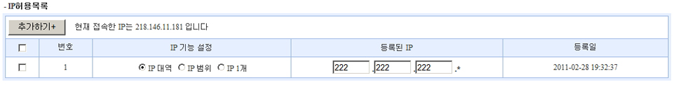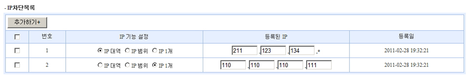 - IP차단목록 : 차단할 아이피를 추가합니다. 아이피는 대역이나 범위로도 추가할 수 있으며 특정 아이피로도 추가할 수 있습니다. IP제한 종류가 IP차단으로 설정된 경우 IP차단목록에