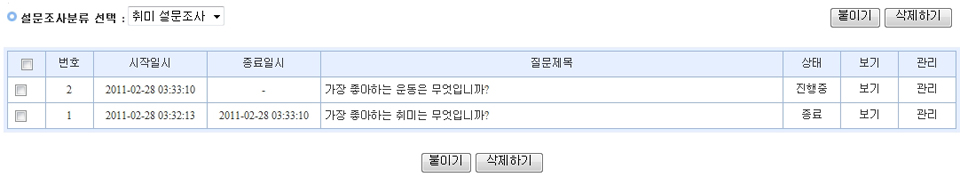 (1) 각 설문조사분류의 질문목록을 보여주는 페이지입니다.