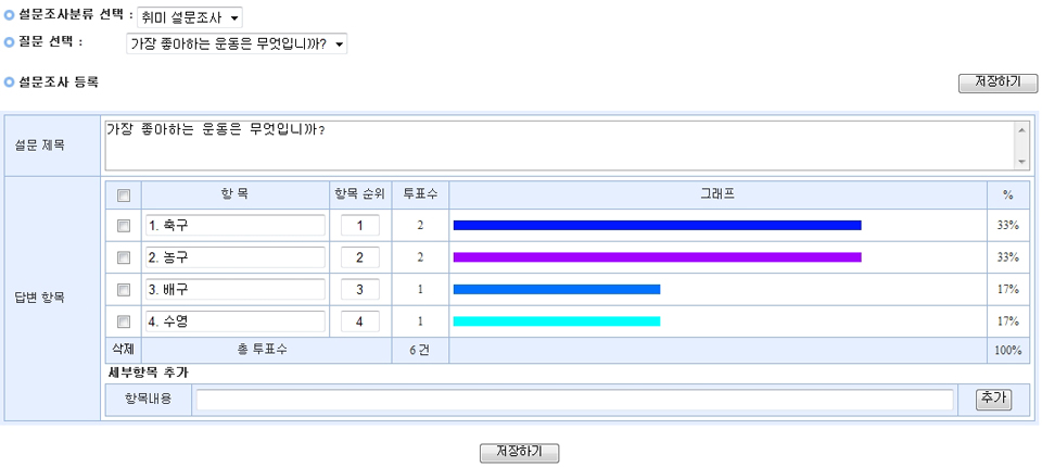 (1) 해당 설문조사분류의 모든 질문과 답변항목, 설문결과를 보여주는 페이지입니다.