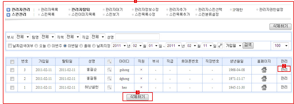 | (1) 관리자탈퇴 페이지에서는 탈퇴한 관리자의 목록을 볼 수 있습니다. |