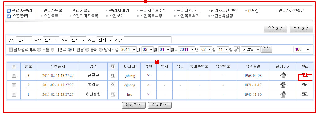 (2) 목록의 체크박스에 체크를 한 후 우측 상단의 "승인하기" 버튼을 클릭하면 해당 신청 건은 승인이 완료되며 관리자목록으로 추가됩니다. "삭제하기"버튼을 클릭한 경우에는 해당 신청 건은 삭제됩니다. |