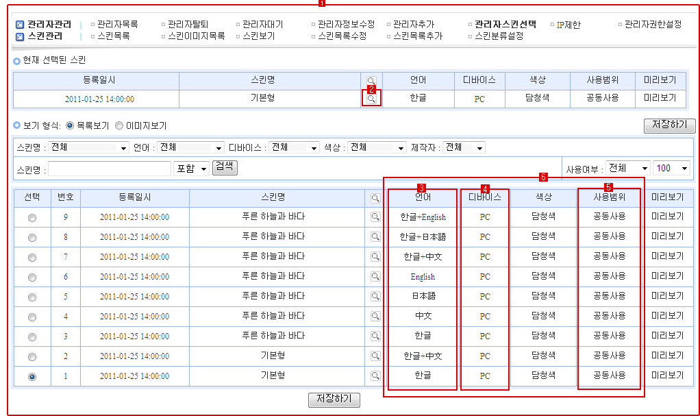 | (1) 관리자스킨선택은 해당 관리자 페이지의 스킨을 선택하는 기능입니다. 이것은 스킨관리와 연동이 되어 작동합니다. |