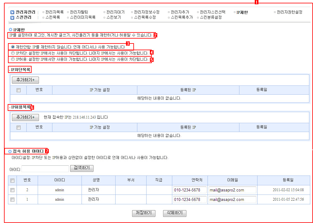 | (1) IP제한은 IP를 설정하여 접속을 차단하거나 허용하는 기능입니다. |