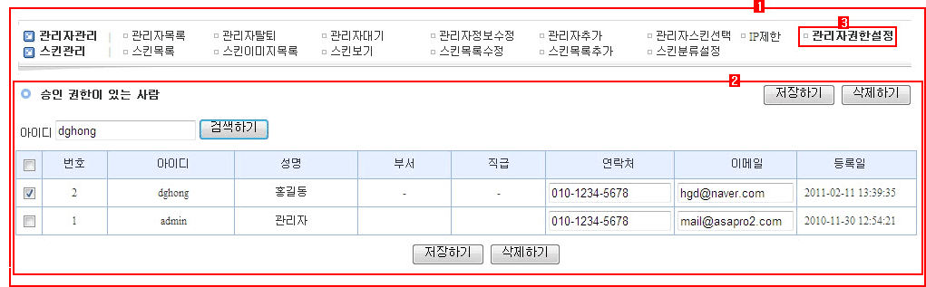 | (2) 관리자 승인 권한이 있는 사람은 관리자 중에서 추가할 수 있습니다. 추가권한은 페이지권한설정을 통해서 설정합니다. |
