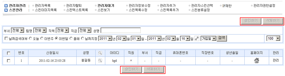(2) 최고관리자가 아닌 경우 관리자관리를 할 수 없습니다. 관리자관리 페이지에 접속하면 그림과 같이 버튼들이 비활성되어 있어 관리자를 승인할 수 없으며 탈퇴, 삭제 등도 할 수 없습니다. |