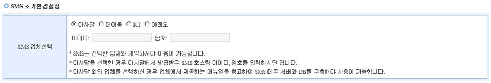 | (1) SMS 기능 사용 시 사용할 SMS 제공 업체를 선택할 수 있습니다. |