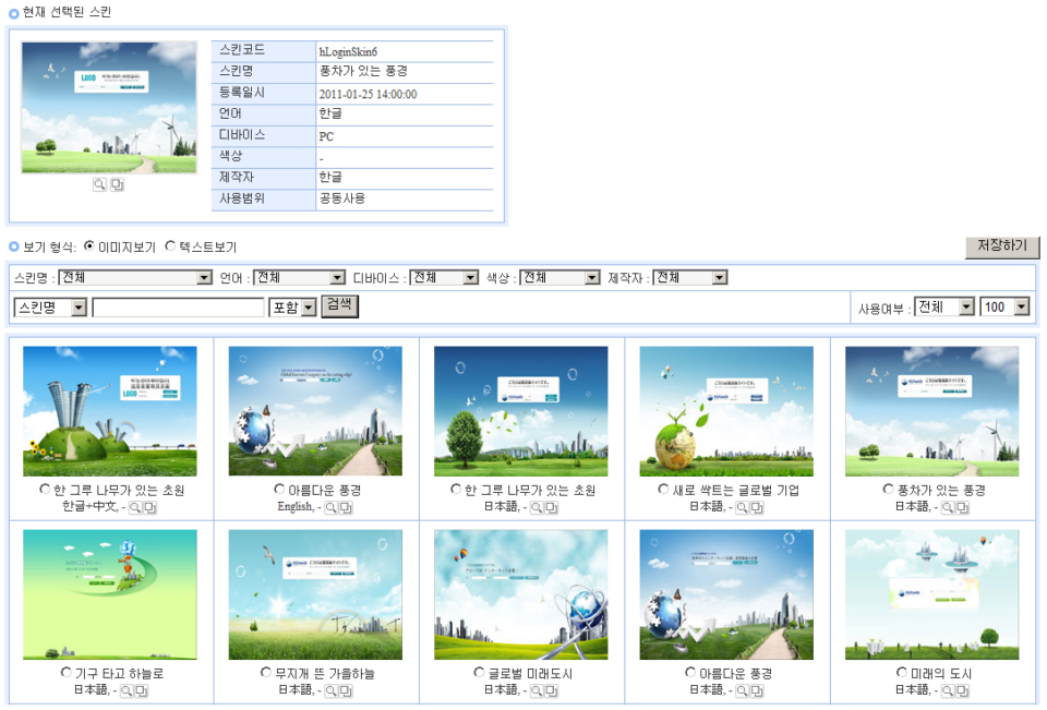 | (2) 여러 가지 스킨 이미지 중 변경하고자 원하는 스킨을 선택한 후 저장을 하면 관리자사이트 로그인 스킨이 변경됩니다. |