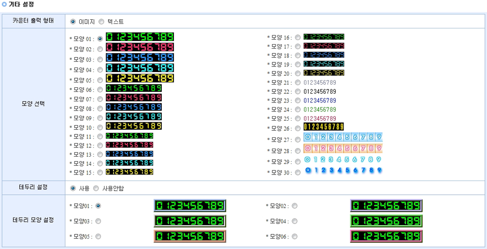 | (1) 카운터의 모양을 설정할 수 있습니다. 카운터 출력형태는 카운터를 이미지로 보여줄 것인지, 단순히 숫자로만 보여줄 것인지를 선택하는 기능입니다. |