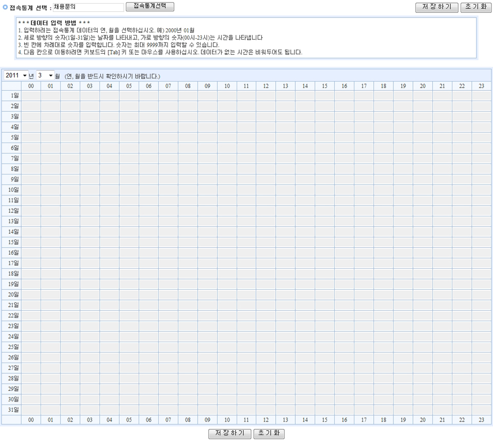 | (1) 데이터입력 페이지는 과거의 접속통계가 잘못되었거나 수정해야 할 필요가 있는 경우 과거의 접속통계 수치를 수정할 수 있는 페이지입니다. |
