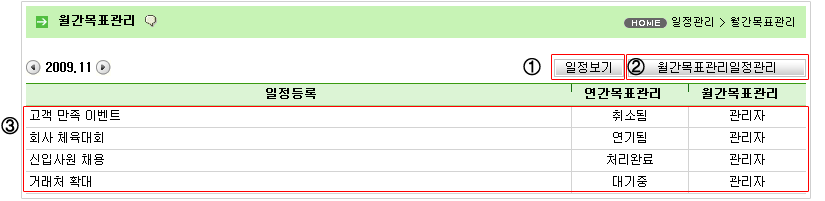 *내용 : 목표 관리의 구체적인 내용 *처리상태 : 목표 관리의 진행상황을 표시 *작성일자 : 작성된 날짜 표시