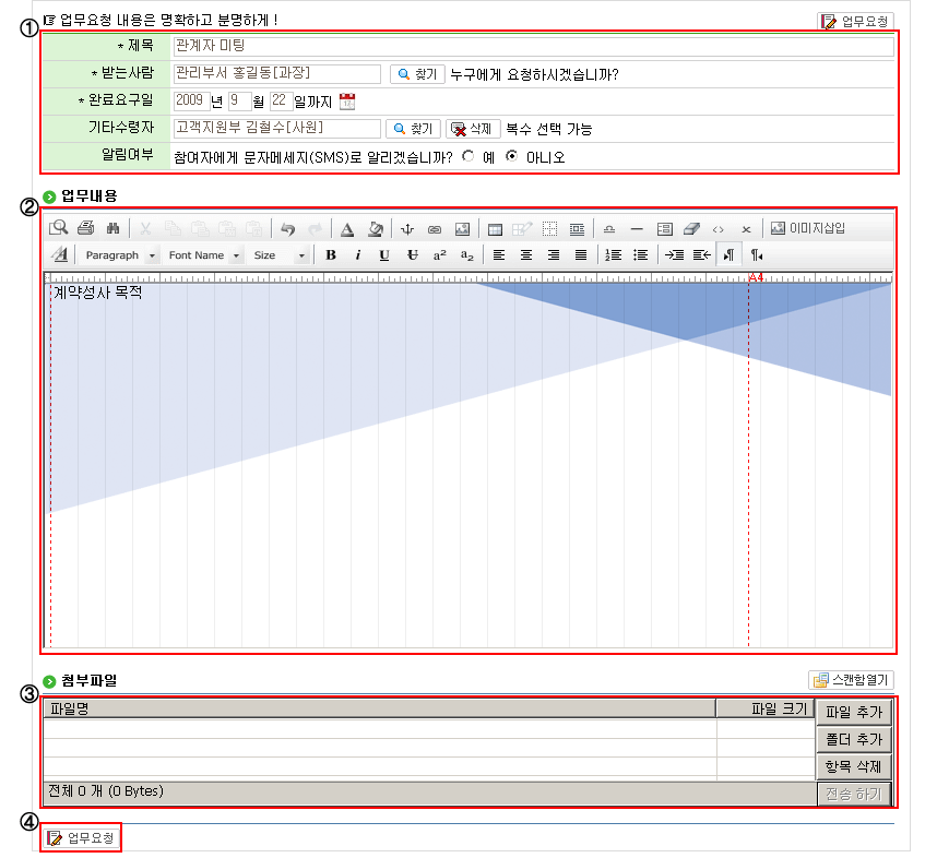 ③ 업무요청에 필요한 첨부파일이 있는 경우에 파일 첨부 기능을 이용하면 됩니다.
