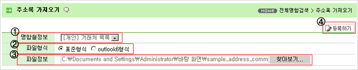 내컴퓨터에 저장된 주소록을 그룹웨어에 일괄등록할 수 있습니다.