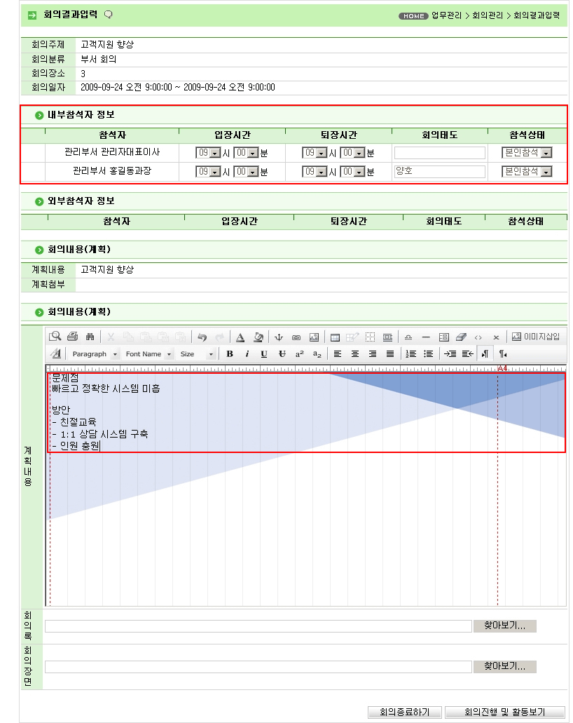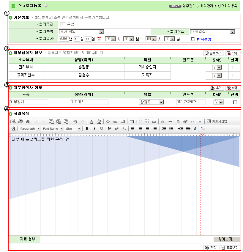 가 발송됩니다. ③ 외부 참석자 정보를 수동으로 입력하십시오. SMS 수신여부를 결정하시면 자동으로 문자 메시지가 발송됩니다. ④ 회의 내용을 입력하시고 “저장” 버튼을 클릭하시면 회의가 성공적으로 등록됩니다. |