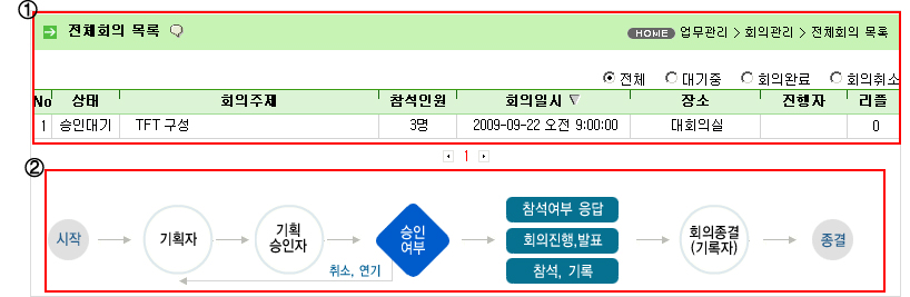 ① 등록된 회의 상태(대기,완료, 취소)에 따라 회의 목록을 확인할 수 있습니다. ② 일반적인 회의 절차를 도표로 보실 수 있습니다. |