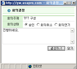 ① 신규 회의를 등록할 수 있습니다. ② 사용자가 회의 권한이 있을 경우 “회의결정” 버튼이 발생하면 클릭 시 다음과 같은 팝업창이 발생합니다. |