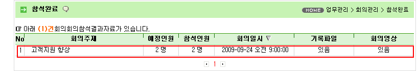 사용자의 회의 내용을 일괄적으로 관리 및 열람할 수 있습니다. 회의함은 참석여부요청, 참석예정, 참석완료, 불참, 취소 연기로 구성되어 있으며 참석완료함의 경우 다음과 같이 페이지가 구성됩니다. 해당 내용 클릭 시에 상세 내용을 볼 수 있습니다. |