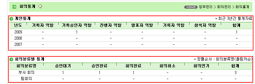 | 회의 관련 통계를 한눈에 파악할 수 있으며 개인통계와 회의분류별 통계로 구성됩니다. |