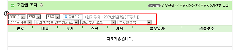 ① 검색기간을 주 단위로 설정하여 일일업무를 검색할 수 있으며 업무일자순, 관리 항목, 관리부서, 관리원 등으로 분류할 수 있습니다.