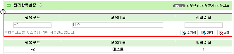 ① 관리할 항목이름과 정렬순서를 입력하신 후에 저장할 수 있으며 불필한 항목은 수정 및 삭제할 수 있습니다. (단, 항목코드는 시스템에 의해 자동관리됩니다.)