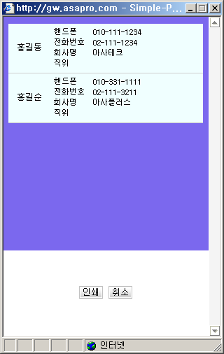 ④ 다음과 같이 새창이 나타나며 선택된 명함철을 인쇄할 수 있습니다.
