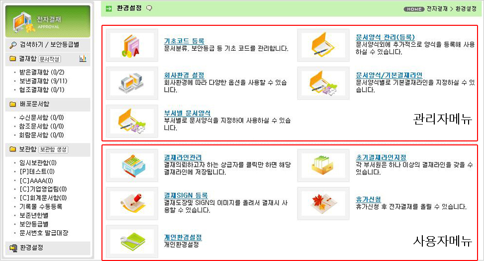 전자 결재와 관련된 모든 기본설정을 할 수 있으며 관리자 메뉴와 사용자 메뉴로 나뉘어져 있습니다. |