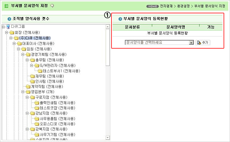 ① 원하시는 부서와 문서양식을 선택하여 추가 버튼을 클릭하십시오