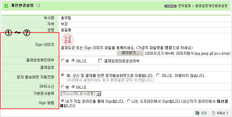 ① Sign 이미지는 결재 Sign 이미지를 등록하는 기능입니다. ② 결재암호확인여부는 결재암호 사용여부를 선택하는 기능이며 결재암호를 로그인 암호와 다르게 설정하고자 할 때는 반드시 “결재암호따로생성여부”를 선택하여야 합니다. ③ 결재암호는 사용자가 원하는 결재암호를 입력하시면 됩니다. ④ SMS 수신은 모든 결재 시에 SMS 수신 여부를 선택하는 기능입니다. ⑥ 기본문서분류는 문서 분류별로 다른 설정을 할 수 있는 기능입니다. ⑦ Sign 방법은 사용자가 원하는 Sign 방법(온라인/오프라인)을 선택하는 기능입니다.