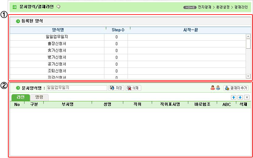 ① 등록된 양식은 전자결재에 등록되어 있는 모든 문서를 확인할 수 있습니다. ② 문서양식에 따라서 결재라인을 생성, 수정, 삭제할 수 있습니다. 결재라인 생성의 자세한 방법은 문서양식/기본결제라인 설명 페이지를 참고하십시오