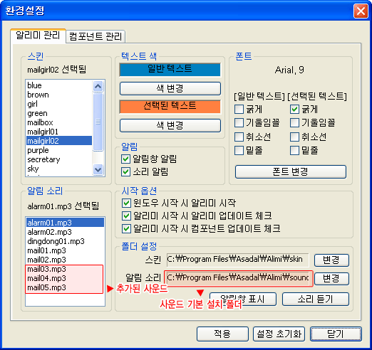 기본 설치 폴더는 C:\Program Files\Asadal\Alimi\sound\입니다.