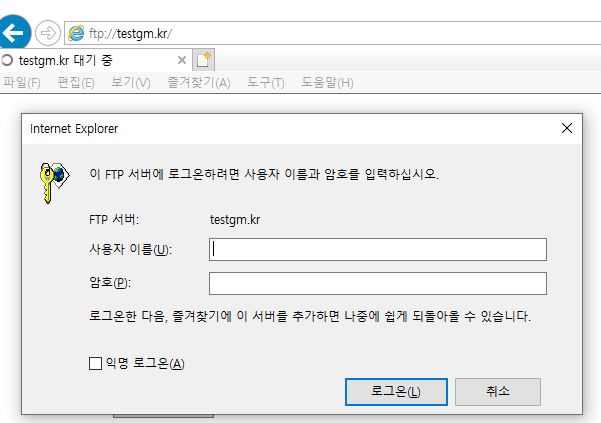 1. 익스플로러를 실행한 후, 다음과 같은 형식으로 FTP 주소를 입력하고 'Enter'를 치면 다음과 같은 로그인 창이 나옵니다.