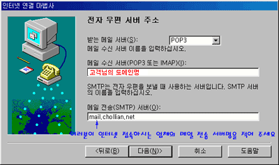 - 전자메일서버에서 받는 메일서버에는 고객님의 도메인명으로 하고, 보내는 메일서버는 ISP의 SMTP서버(보내는 메일 서버) 이름을 입력한 후 다음을 클릭합니다.