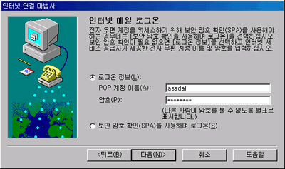 - 메일 로그온 부분에는 호스팅 회사로부터 제공받은 계정이름과 암호를 입력한 후 다음을 클릭합니다.