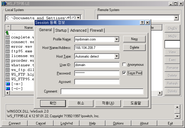 - 여기 Session 등록정보에 자신이 주로 사용하는 FTP 서버나 Anonymous FTP 서버의 정보를 기록해 두면 다음 번에 FTP 서버에 접속할 때에는 접속하려는 FTP 서버의 Profile Name 만으로 쉽게 접속할 수 있습니다. 새로 FTP 서버에 대한 정보를 기록하는 방법은 호스트의 주소와 사용자 계정, 패스워드를 입력한 후에 [적용(A)]을 누르면 저장됩니다.