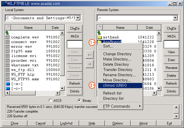 를 누릅니다. 이 때, cgi 파일은 ASKII 형식으로, 그림 파일은 Binary 형식으로 보냅니다. HTML 파일은 어떤 형식이라도 상관 없습니다.