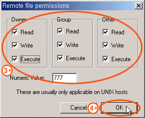 그림의 체크박스에 적당히 체크를 하여 원하는 퍼미션으로 조정합니다. 그림과 같이 모든 체크박스에 체크를 하면 퍼미션이 777로 변경됩니다.