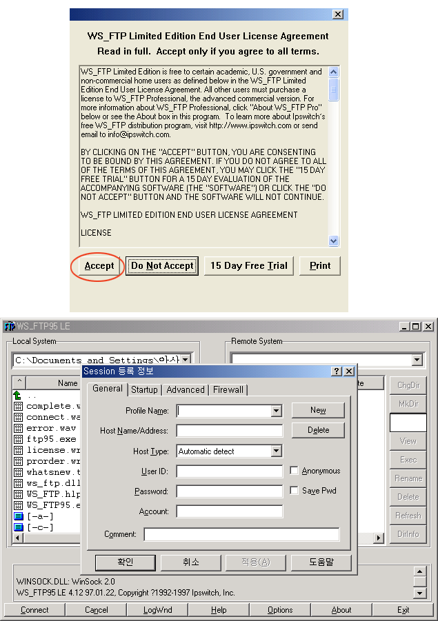 - 파일들 중 WS_FTP95.exe 를 두 번 클릭하면 아래와 같이 프로그램이 실행됩니다. Accept 를 선택하면 프로그램이 실행됩니다.