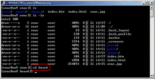 cd 명령어는 도스의 cd와 그 쓰임새가 같으나 사용할 때에 한가지만 주의하시면 됩니다. 도스에서는 cd\dos와 같이 사용하지만, 유닉스에서는 반드시 cd 뒤에 한칸을 띄우고 '\' 대신 '/'를 사용한다는 것입니 다.