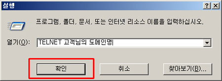 ㆍ윈도우 시작 -> 실행을 클릭한 후 입력창에 telnet 도메인명을 입력하고 "확인"버튼을 클릭합니다.