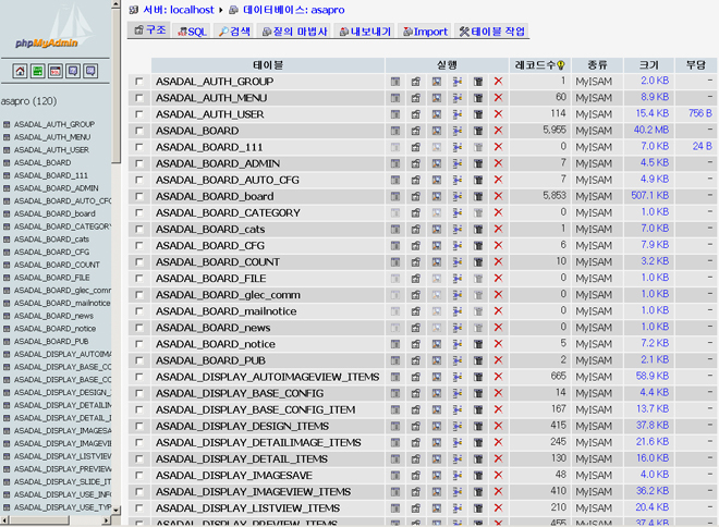 ㆍMySQL DB명, USER명, 패스워드를 입력하여 로그인을 하면 데이터베이스 관리화면이 뜹니다.