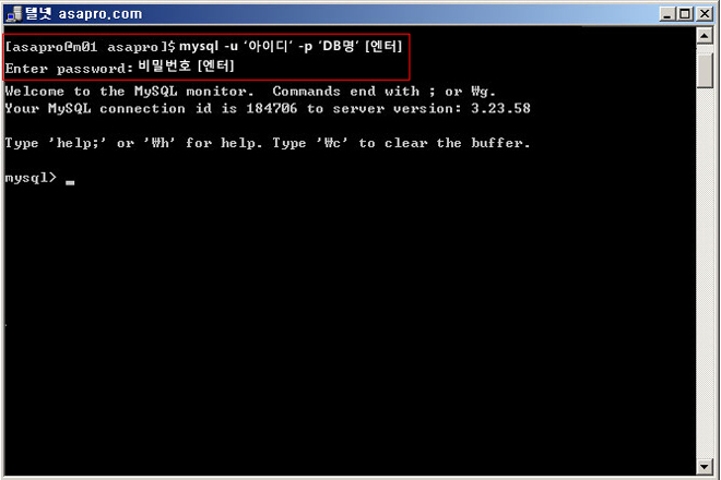 ㆍ도스창 화면이 뜨면 로그인 아이디와 암호를 입력하여 접속하신 뒤 "mysql 접속 명령어"를 쳐 줍니다.