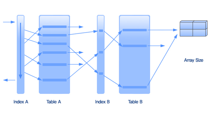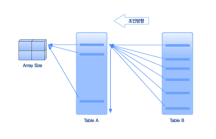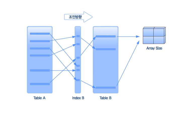 즉, 첫 번째 값이 Index A~Table B를 거쳐 운반단위(Array Size)에 적재되면 두 번째 값이 Index A에서 시작된다. 조인은 복수의 테이블이 하나로 합쳐지는 것이 아니라 하나의 테이블에서 조건에 맞는 특정 연결고리를 경유해 다른 테이블에 접근하기 위한 방법이다. 따라서 일반적으로 정렬을 하기 위해서 임시 테이블을 생성하는 경우는 있어도 조인을 하기 위해서 임시 테이블을 생성하지는 않는다.