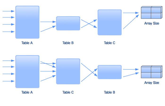 여러 개의 테이블을 논리적으로 결합하는 경우 구동 테이블이 결정되고 나면 나머지 테이블들 중에 먼저 읽을 테이블과 나중에 읽을 테이블의 우선순위를 결정해야 한다. 구동 테이블이 결정되었다고 나머지 테이블들의 조인 순서를 고려하지 않는다면 성능 향상을 기대할 수 없다. 위 그림에서 Table A -> Table B -> Table C 순으로 조인을 걸면 액세스해야 하는 데이터의 양이 줄어 성능을 향상시킬 수 있다.